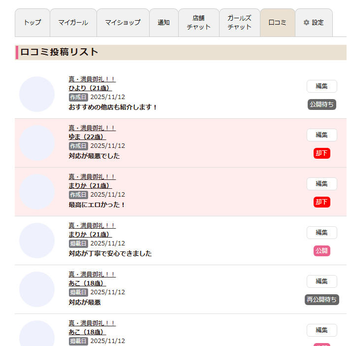 編集内容を再投稿すると、ステータスが 「再公開待ち」 に変わり、再度店舗側の承認が必要になります。