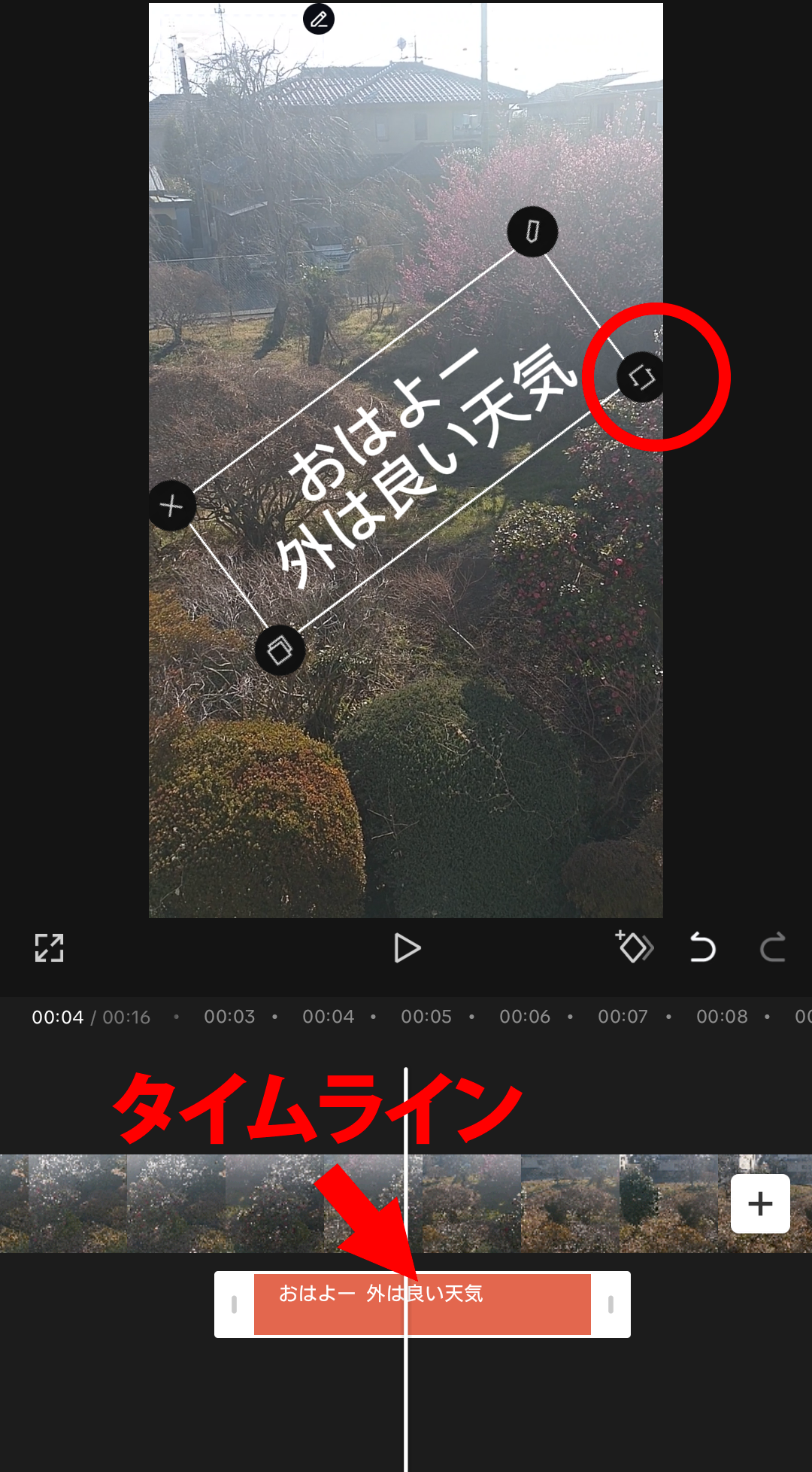 ・表示された枠の右下のアイコンをドラッグしてサイズや角度を変更できます